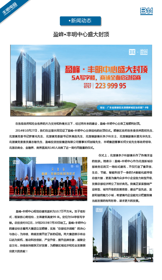 在各級政府及社會各界的大力支持和熱情關(guān)注下,經(jīng)過兩年來的建設(shè),盈峰·豐明中心盛大封頂